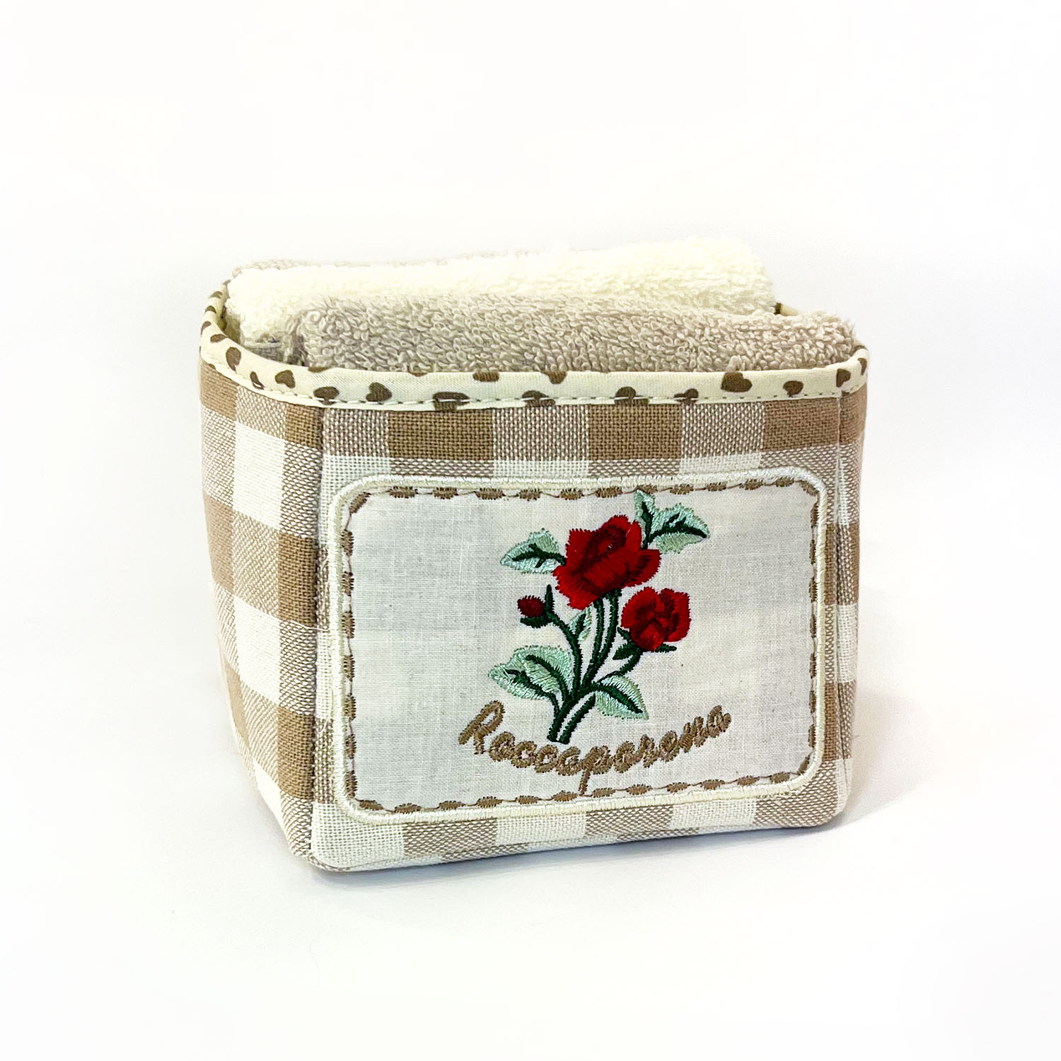 Contenitore con 3 lavette all’interno. Disponibile in due colori: Beige e Rosso.