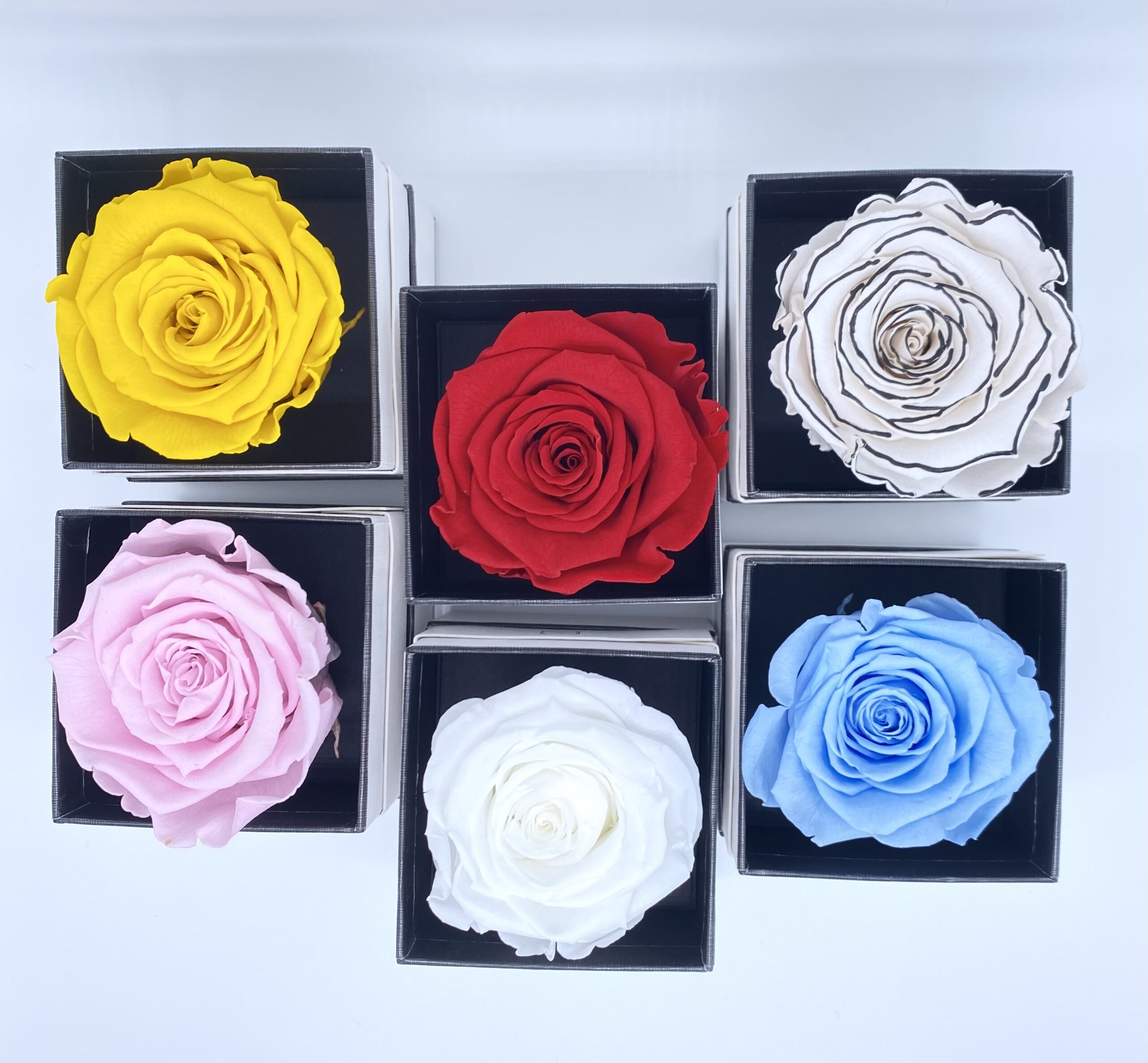 Sono rose vere, stabilizzate, di qualità certificata. Sono raccolte a mano nel momento della loro massima bellezza e freschezza. Ne puoi trovare di diverse colorazioni: rossa, rosa, azzurra, gialla, bianca e bianca stilizzata.