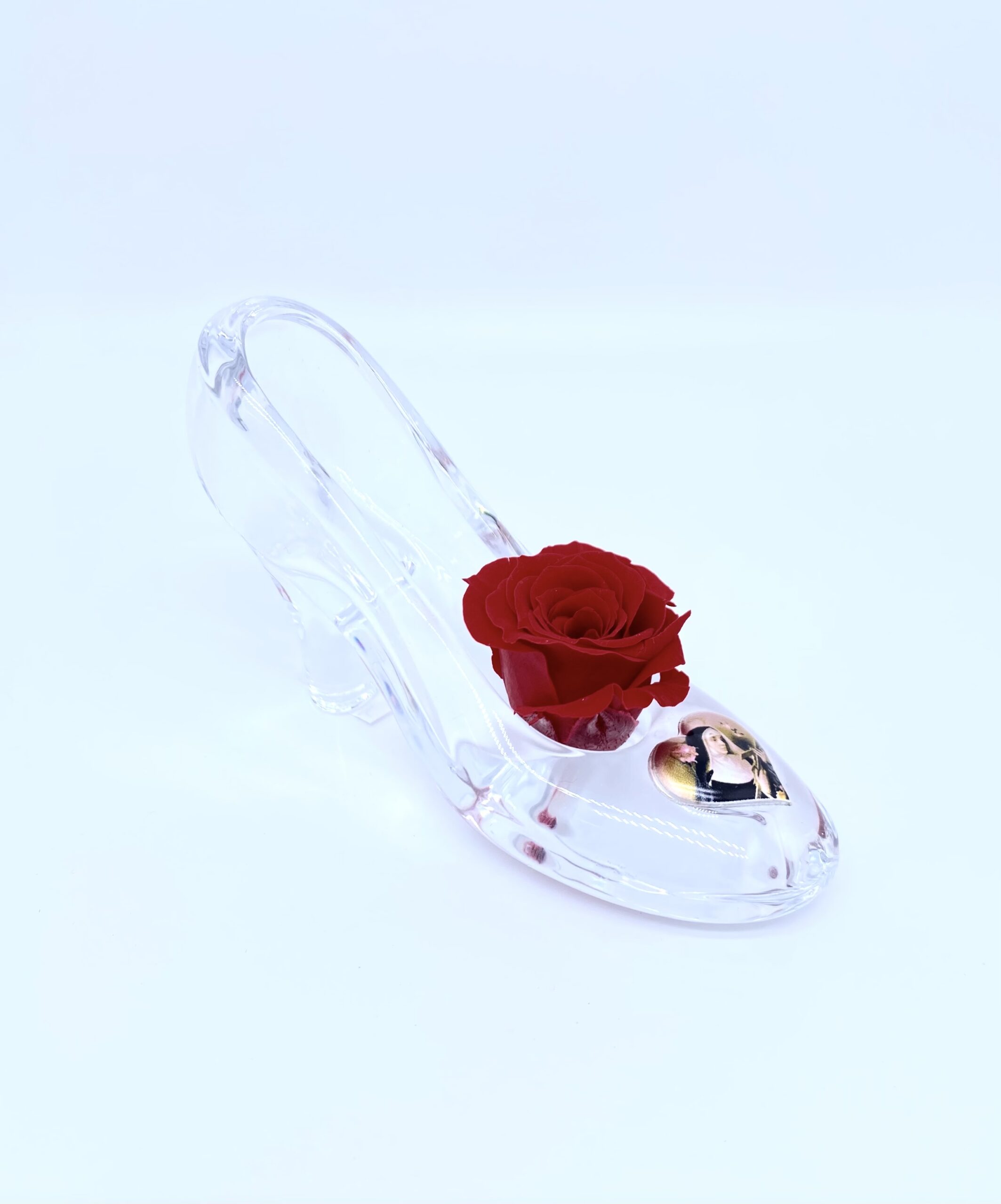 Sopra la scarpa da principessa c’è questa rosa stabilizzata, vera e nella punta della scarpa è presente un immagine di Santa Rita.