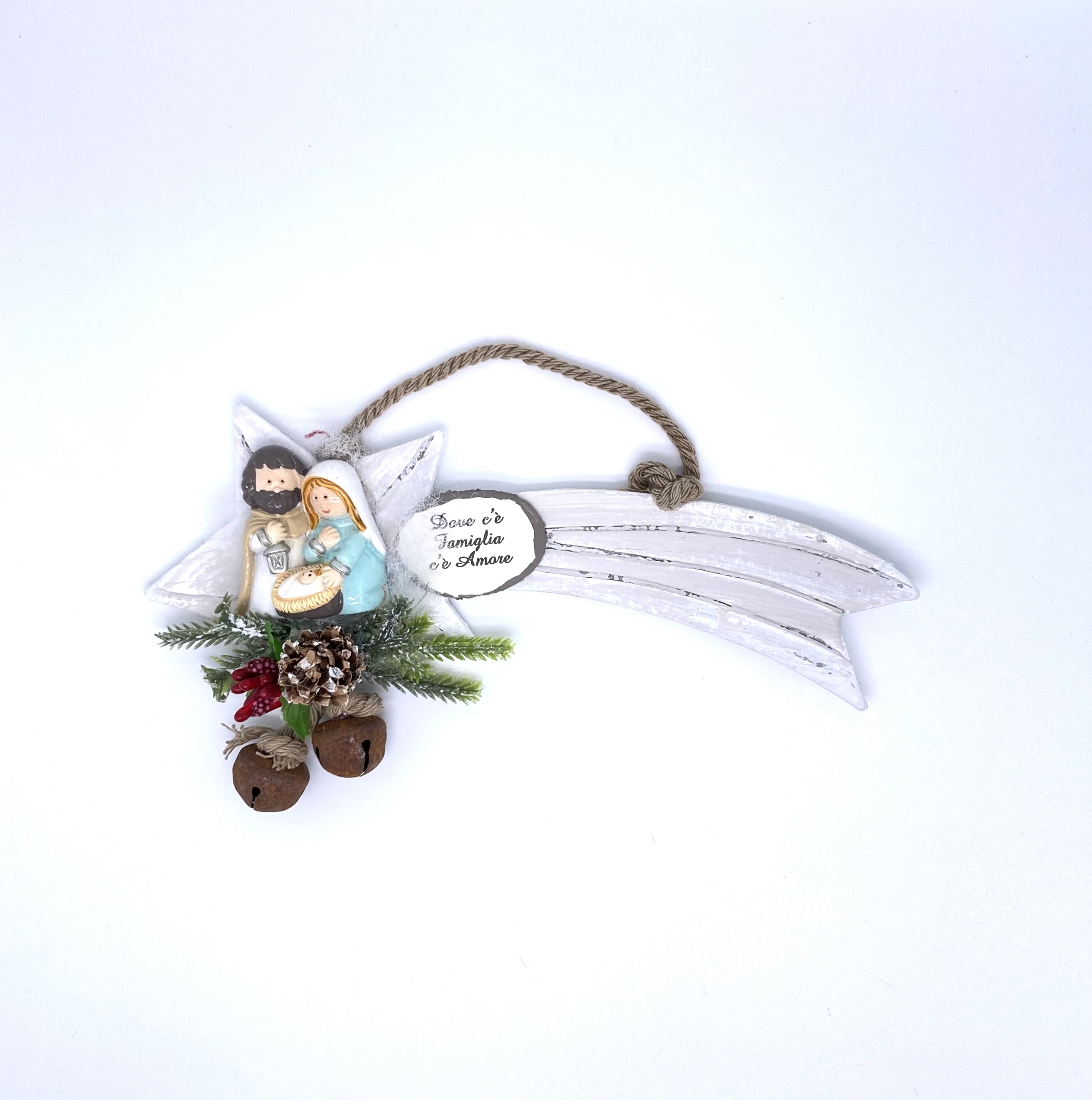 Stella di Natale con il presepe incorporato, all’interno della quale c’è una frase: “Dove c’è Famiglia c’è Amore”. Interamente fatto a mano con creatività e passione.